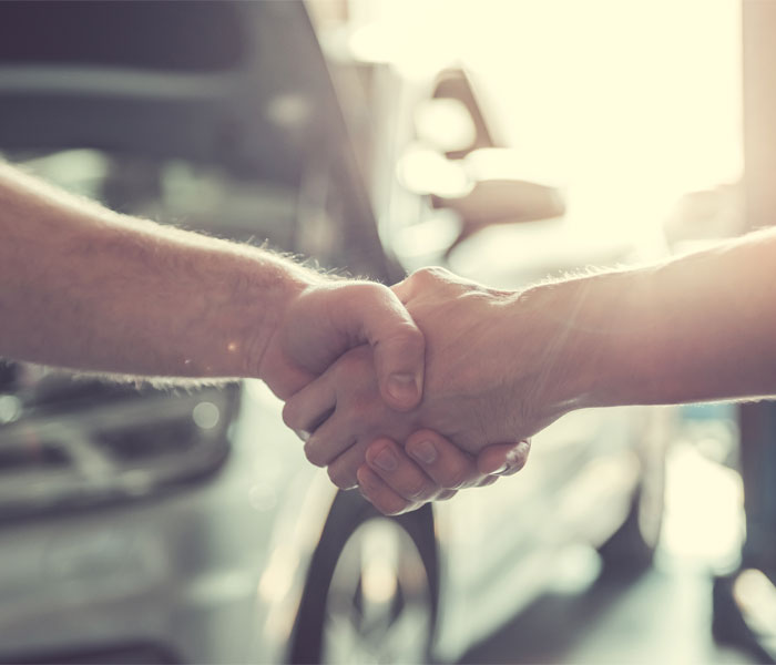 Two people shaking hands with cars in the background, suggesting a deal or agreement in a well-lit environment.