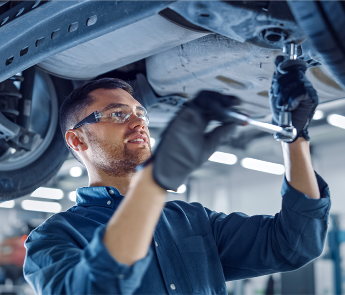 Mechanic wearing safety glasses and gloves uses a wrench to work under a vehicle in a well-lit auto repair shop.